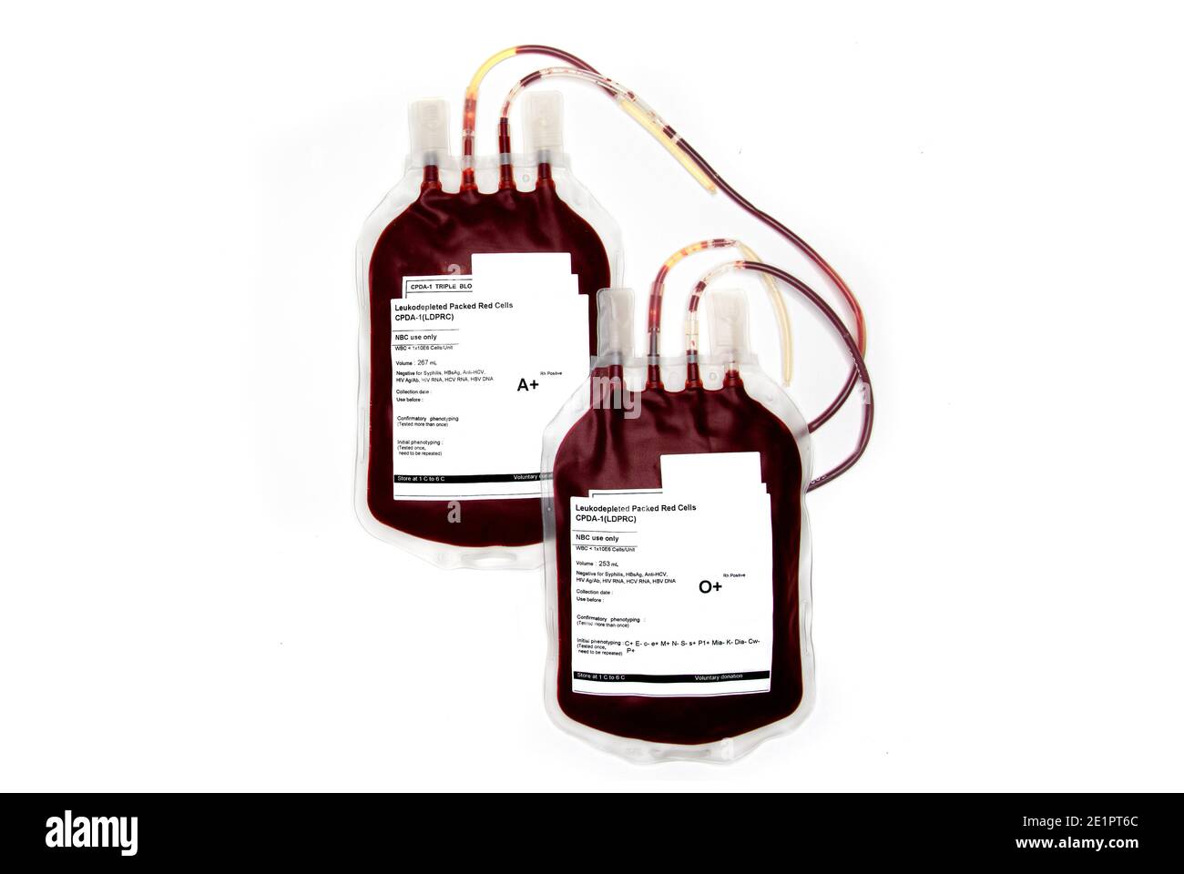 Bolsas de sangre fresca o de glóbulos rojos envasados, aisladas en el fondo blanco. Transfusión