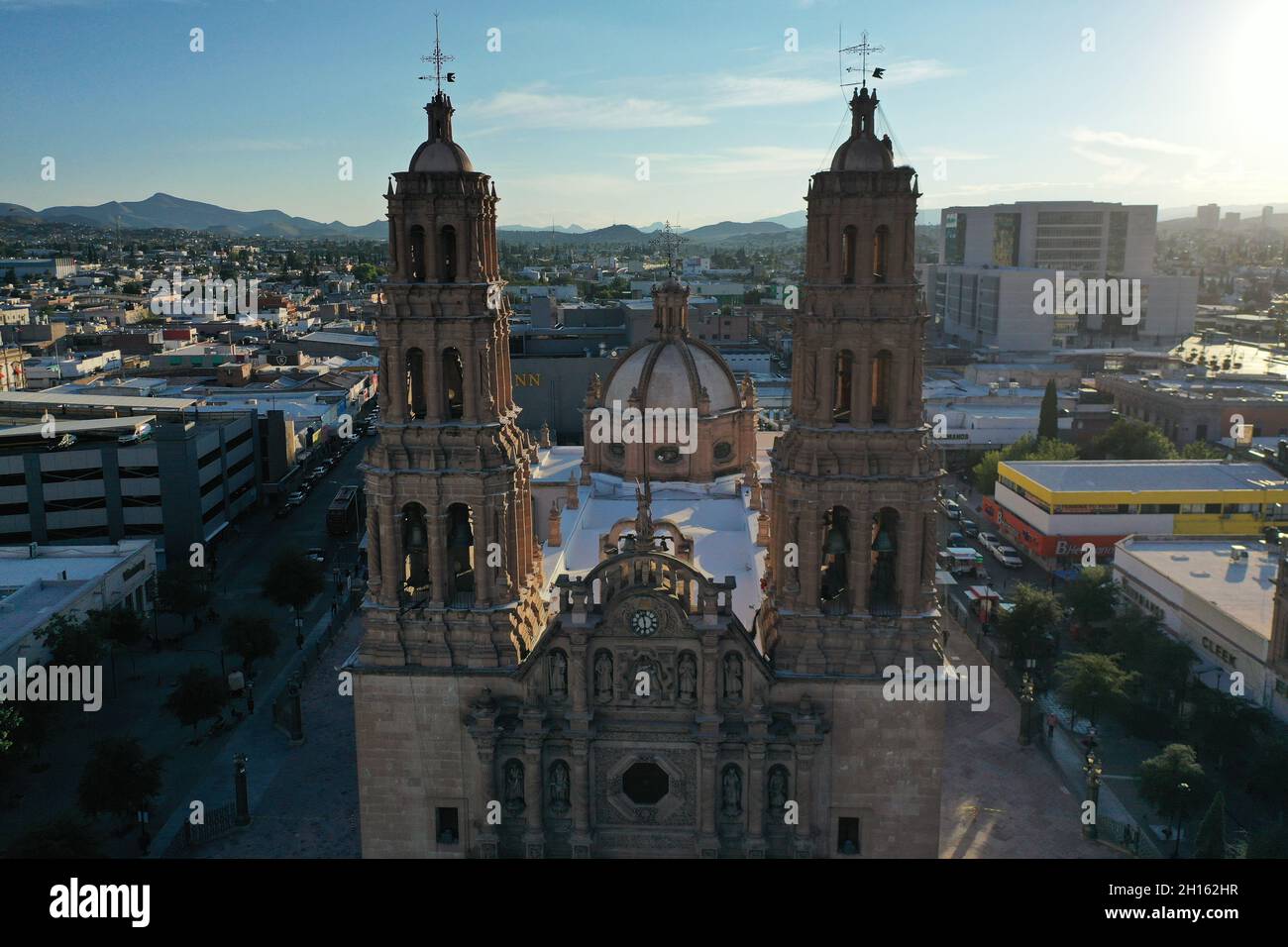 Aerial view of the Cathedral of Chihuahua and the seat of the Archdiocese in the city of