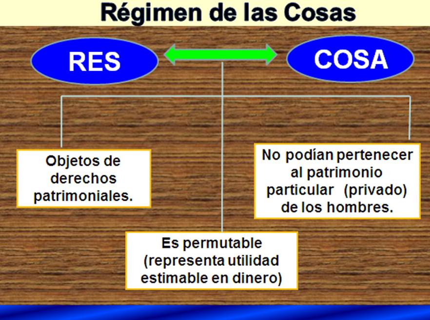 LA CLASIFICACIÓN DE LAS COSAS EN EL DERECHO ROMANO. LA CLASIFICACIÓN DE LAS COSAS EN EL DERECHO ROMANO. La palabra res tiene un sentido tan amplio para Roma como lo tiene la palaba cosa en nuestro lenguaje, comprendiendo, "todo lo que tiene entidad, ya sea corporal o espiritual, natural o artificial, real o abstracta"[1] y como lo que estamos estudiando es derecho, nos.