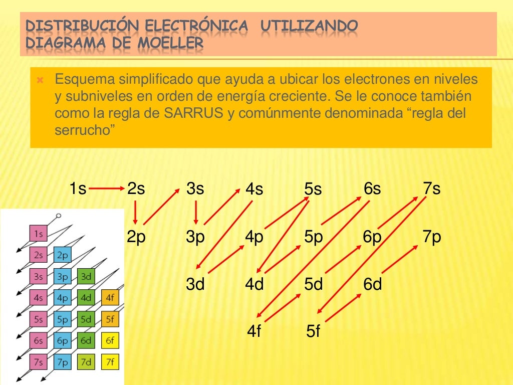 En este artículo vamos a presentarte un método más sencillo para averiguar la configuración electrónica de un elemento, llamada regla de Möller (o más comúnmente, regla del serrucho). Este método implica ordenar los niveles de energía y sus orbitales para luego distribuir los electrones siguiendo la dirección de las diagonales, de la.