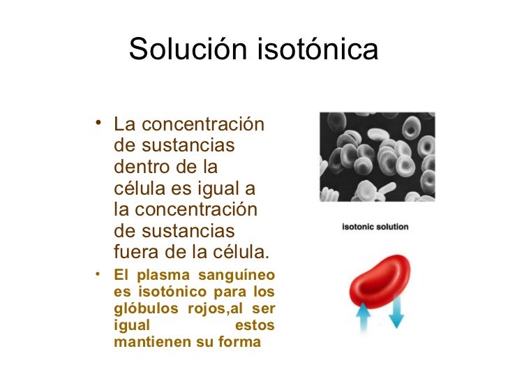 En una solución ISOTÓNICA (iso = igual), el líquido extracelular tiene la misma osmolaridad que la célula y no habrá ningún movimiento neto de agua hacia adentro o hacia afuera de esta. Ejemplos de soluciones hipotónicas, hipertónicas e isotónicas: NaCl 0,9%. Dextrosa al 5%. Ringer Lactato. Hipotónico, hipertónico e isotónico son.