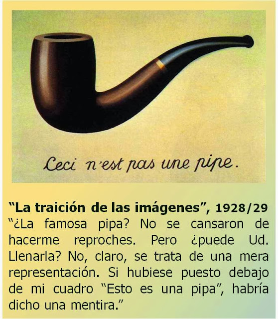 Esta obra del pintor surrealista René Magritte muestra una pipa y, debajo de ella, una cita el artista, escrita en francés, "Ceci n'est pas une pipe", que traducida significa "Esto no es una pipa".. La obra fue creada en 1929, siendo realmente desconcertante ya que en un primer momento nos parece que la frase se contradice con lo representado.