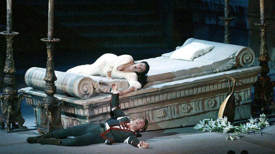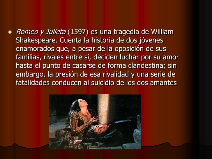 Al final de la obra de William Shakespeare "Romeo y Julieta", tanto Romeo como Julieta se suicidan en circunstancias trágicas. Justo antes de casarse con París, un pretendiente dispuesto, el cuerpo sin vida de Julieta es descubierto y Colocados en la tumba de la familia Capuleto. Romeo se entera de su muerte y va a Verona con la intención de.