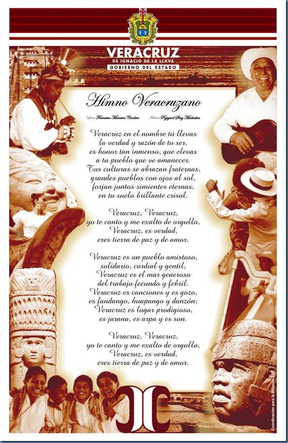 Himno Veracruzano (mex) De Wikisource, la biblioteca libre. Veracruz en el nombre tú llevas la verdad y razón de tu ser, es honor tan inmenso, que elevas a tu pueblo que ve amanecer. Tus culturas se abrazan fraternas, grandes pueblos con ojos al sol, forjan juntos simientes eternas, en tu suelo brillante crisol.