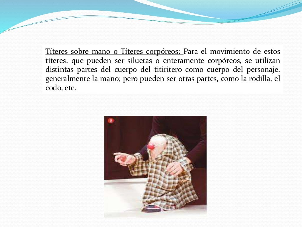Qué son. Los títeres o marionetas son figuras de seres humanos, animales o seres fantásticos elaborados en todo tipo de materiales y dimensiones, que son manejados por una persona para hacer representaciones teatrales. Los títeres se caracterizan porque su movimiento depende de la mano del titiritero (la persona que lo acciona).