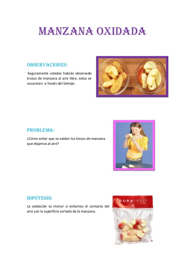 OXIDACIÓN DE LA MANZANA RESUMEN: Cuando las frutas se parten o se abren, ciertas enzimas llamadas enzimas oxidativas reaccionan con el oxígeno del aire y se forman productos que le dan un color café a la fruta, por ejemplo, en las manzanas, los plátanos o los aguacates.