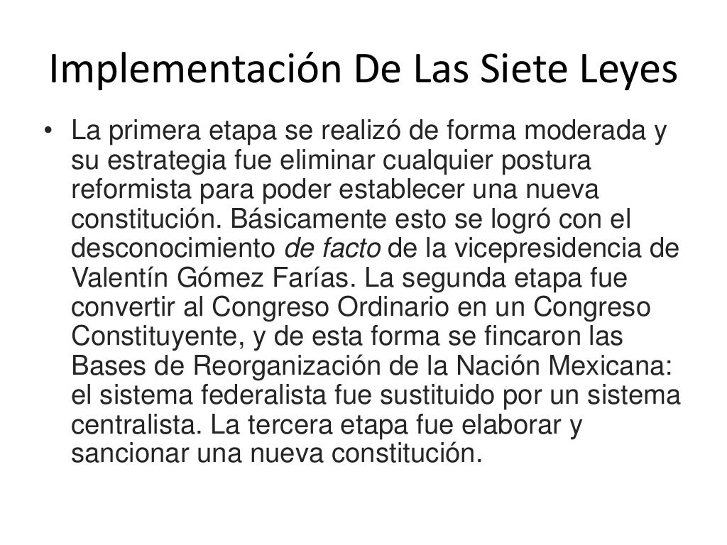 Categoría: De la Independencia al México Actual. Las Siete Leyes Constitucionales o Constitución de Régimen Centralista de 1836 es un conjunto de leyes de rango constitucional, promulgadas el 30 de diciembre de 1836 por el presidente interino de México, José Justo Corro. Las leyes le dieron forma a un régimen centralista, contrario al.