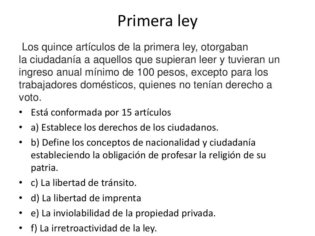 Leyes Constitucionales de 1836 (30 de diciembre de 1836) Primera. Derechos y obligaciones de los mexicanos y habitantes de la República. Segunda. Organización de un Supremo Poder Conservador. Tercera. Del Poder Legislativo, de sus miembros y de cuanto dice relación a la formación de las Leyes. Cámara de Diputados. Cámara de Senadores