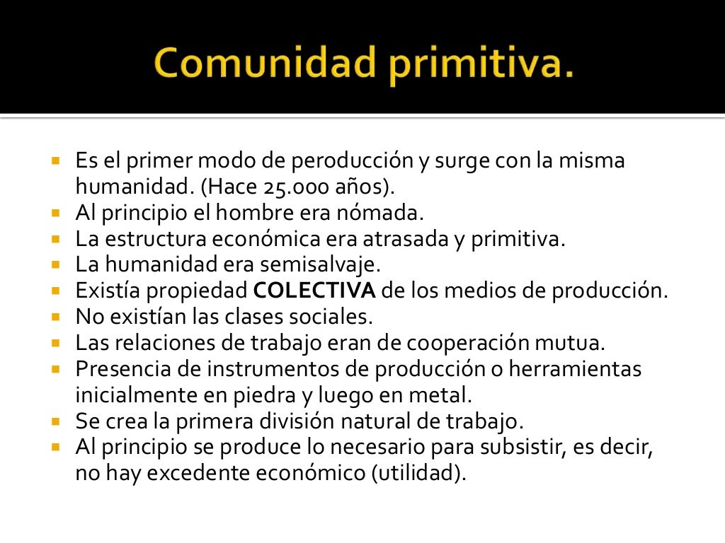 Los dueños de los medios de producción eran todos los que formaban parte de la tribu o comunidad ya que trabajaban de una manera colectiva. En la prehistoria surgieron nuevos elementos como la agricultura, patriarcado, esclavismo. Estos dieron la iniciativa de iniciar con el siguiente modo de producción. En la época del feudalismo se.