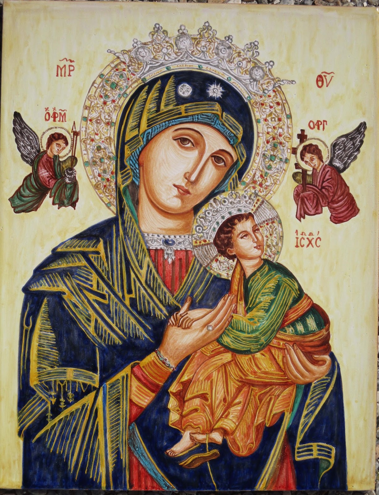 Nuestra Señora del Perpetuo Socorro. Para los templos en su honor, véase Iglesia de Nuestra Señora del Perpetuo Socorro. Estampa de la imagen. La Virgen del Perpetuo Socorro (llamada en la Iglesia ortodoxa Madre de Dios de la Pasión) es una advocación mariana. La imagen original es un icono procedente de Creta y venerado en Roma en la.