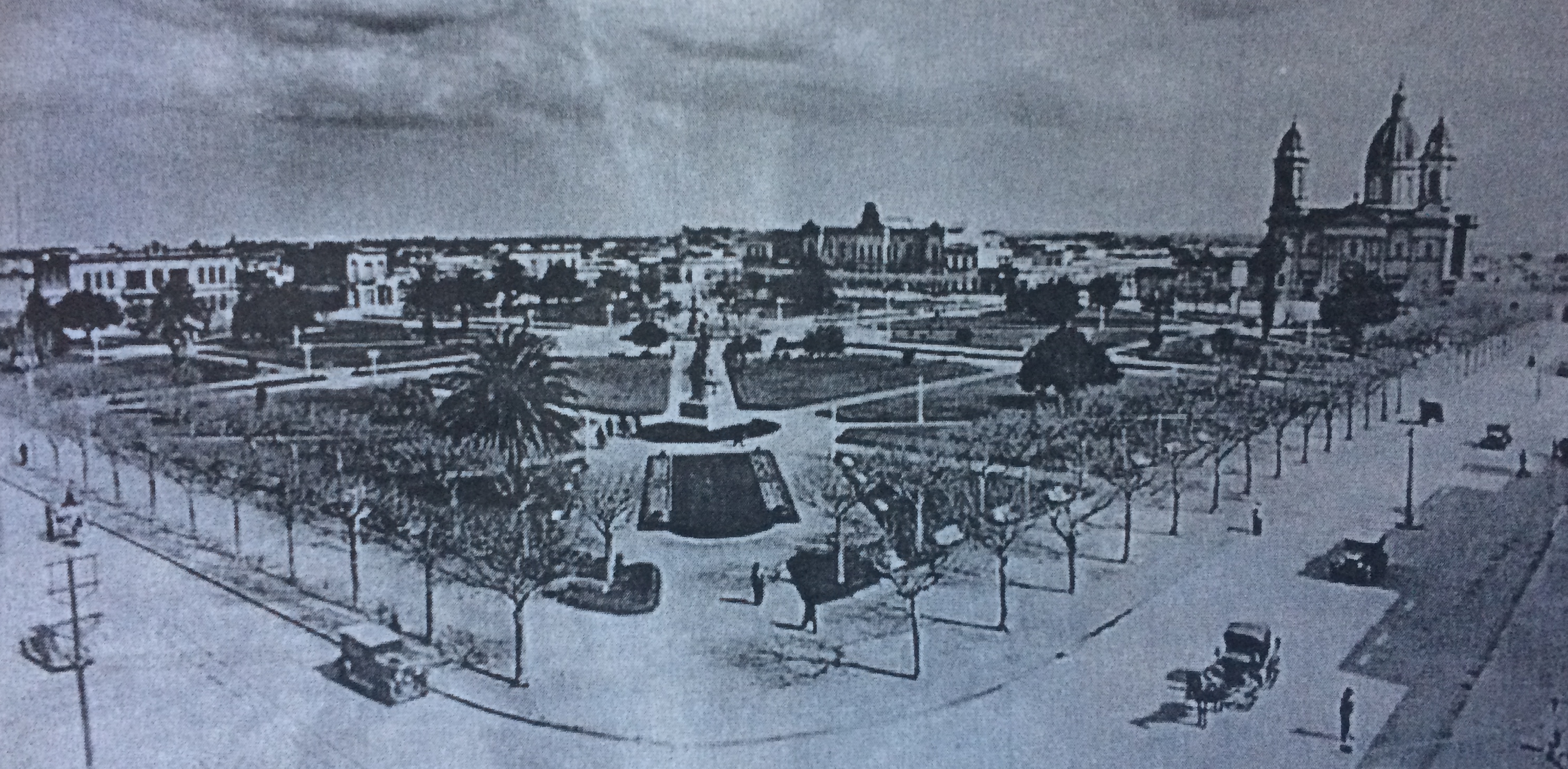 La plaza 25 de Mayo, en una imagen fotográfica panorámica, de principios del siglo XX.