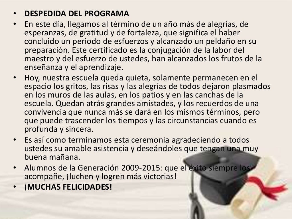 Programa de ceremonia de graduación. Ejemplo del programa de acto de graduación. 1-Bienvenida. 2-Honores a la bandera. 3-Entrada de los alumnos graduados. 4-Presentación del presidium. 5-Mensaje del Director. 6-Entrega de certificados. 7-Mensaje de alumnos graduados.