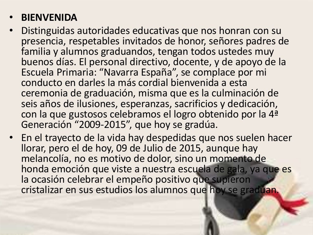 3. • La escuela primaria "Navarra España, turno matutino", les da la más cordial bienvenida a esta ceremonia de graduación de la 4ª generación 2009 - 2015, que representa para nuestros alumnos graduandos, la culminación de una importante etapa en su formación académica y la coronación de su esfuerzo, en el que sus voluntades se han templado y sus inteligencias se han.