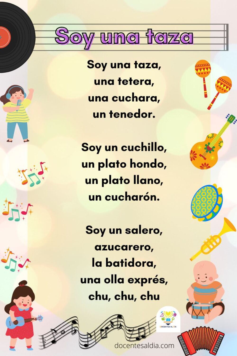 Concepto de Canciones Infantiles. Las canciones infantiles son composiciones musicales especialmente diseñadas para niños. Estas canciones suelen tener letras simples y pegajosas, acompañadas de melodías alegres, que están destinadas a educar, entretener y estimular el desarrollo de los niños. 📋 Copiar.