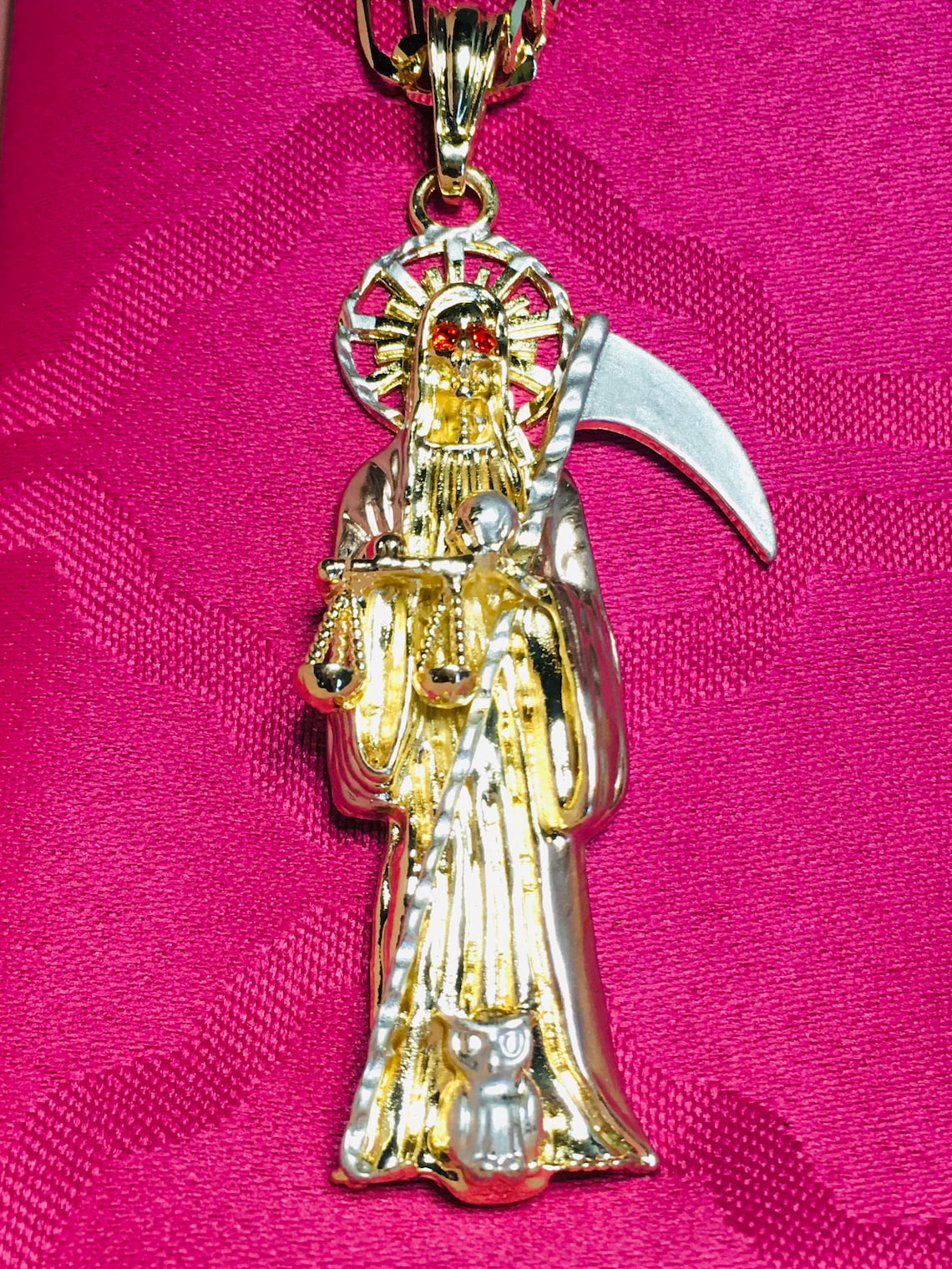 24K Gold Plated Santa Muerte with 26" Necklace Santa Muerte con Cade Rosarios Y Mas
